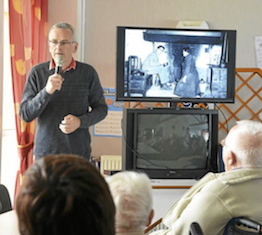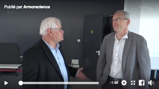 Jérôme Lucas présente sa conférence sur "La fée électricité entre dans les campagnes bretonnes" à Pierre-Noël Favennec, ancien président d’ArmorScience, Pleumeur-Bodou.
