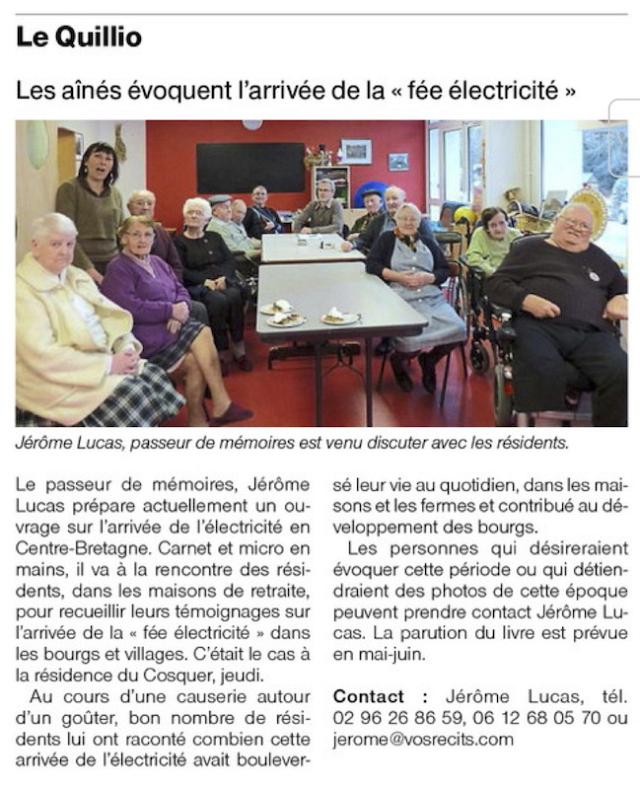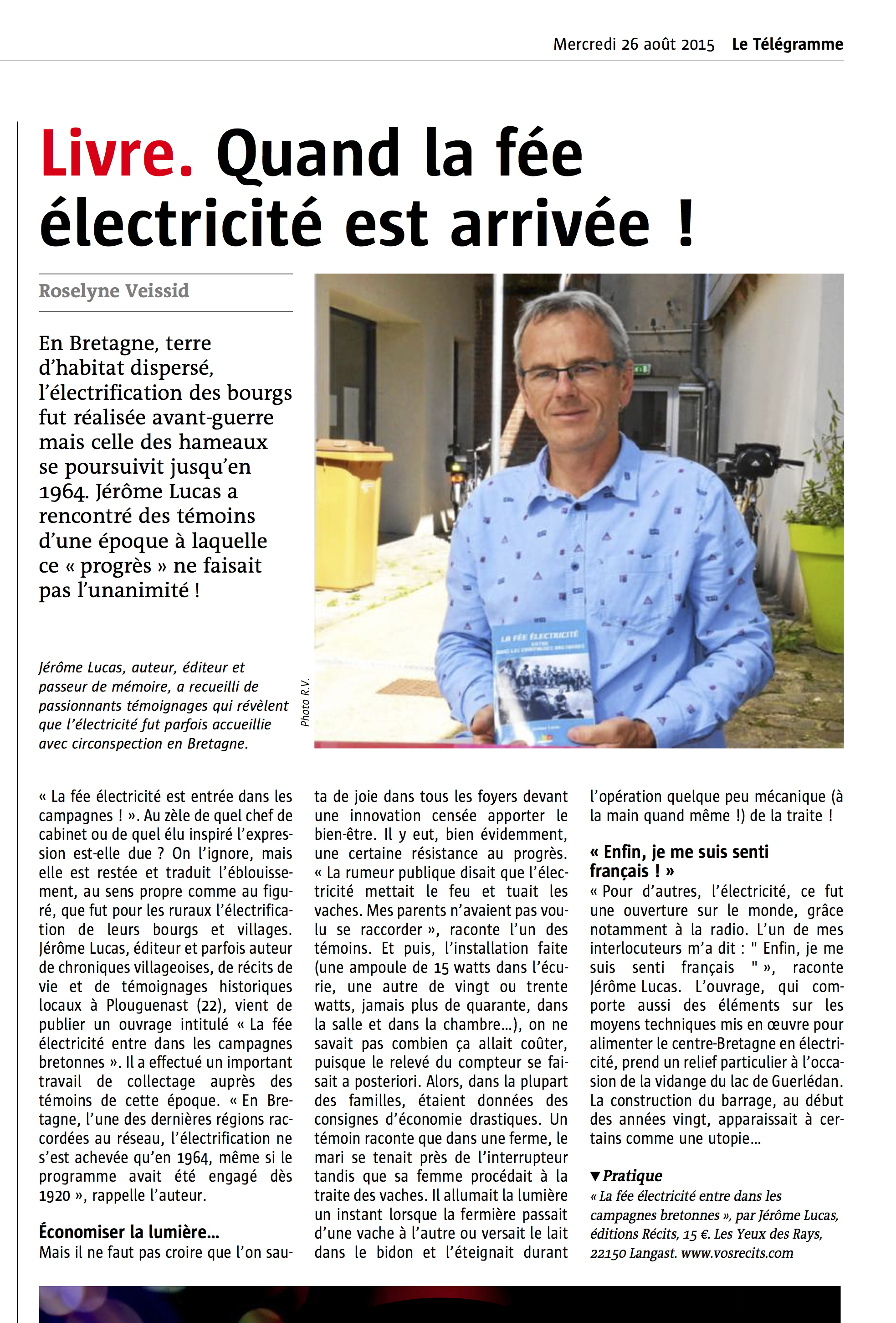 J’ai tardé à vous dire combien la lecture de "La Fée électricité entre dans les campagnes bretonnes" m’a enchantée. J’y ai retrouvé des scènes et des récits comparables à ceux qui m’avaient été transmis dans le Finistère, mais votre ouvrage, bâti sur des recherches autant que sur des témoignages, va plus loin. Cela donne une page d’histoire bretonne qu’on ne peut oublier.