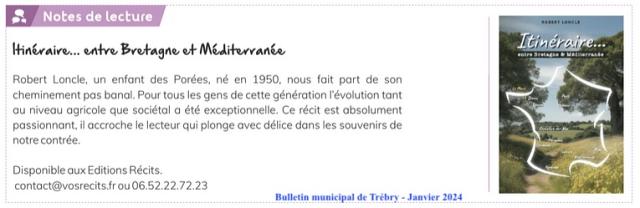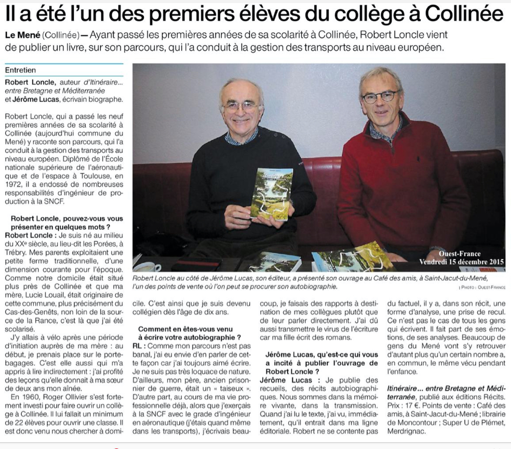 J’ai appris par le journal Ouest-France la parution de ce livre _Itinéraire ... entre Bretagne et Méditerrannée_ de Robert Loncle. J’ai vécu une enfance analogue à celle de l’auteur, que j’ai côtoyé pendant nos quatre années de Collège à Collinée. Mes parents exploitaient une petite ferme près de la source de l’Argueron. J’ai été impressionnée par la foison des détails qui sont repris dans cet ouvrage. La première partie sur la vie à la campagne montre bien la rudesse de certaines activités agricoles d’alors, mais aussi le charme de la vie et des relations humaines dans nos villages. J’ai aussi beaucoup apprécié le récit de sa vie professionnelle qui m’a fait prendre la mesure de la diversité et de la complexité des multiples métiers du transport ferroviaire. Enfin, les précisions apportées pour présenter avec beaucoup d’humanité, de finesse et d’implication, toutes les personnes qu’il cite, sont tout à fait remarquables. Longue et heureuse vie à l’auteur et sa famille entre Bretagne et Méditerrannée !